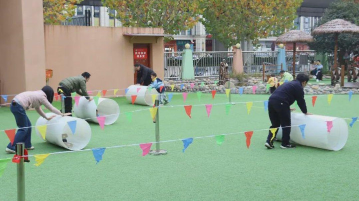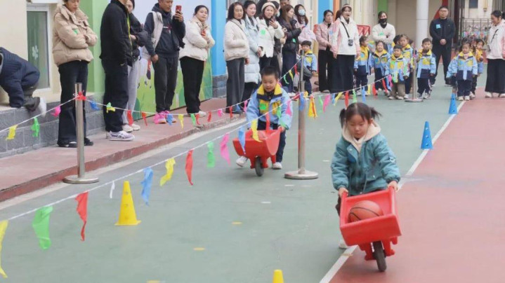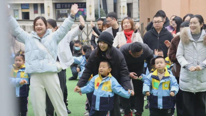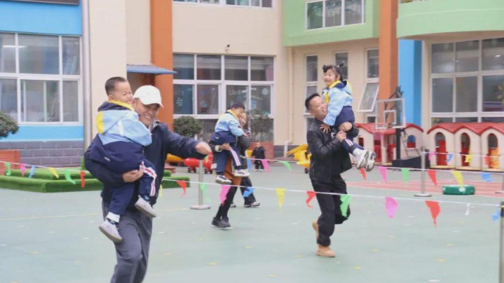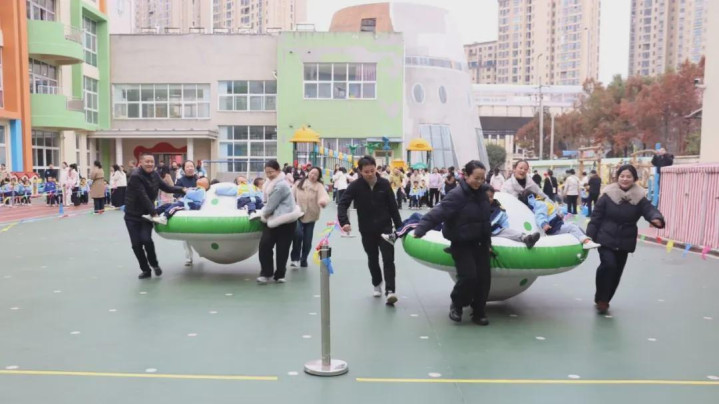 信阳市浉河区幼儿园家长们抬着“飞船”,上面坐着自家的“外星宝贝”,脚步默契又轻快,把爱都‘抬’在手里啦。